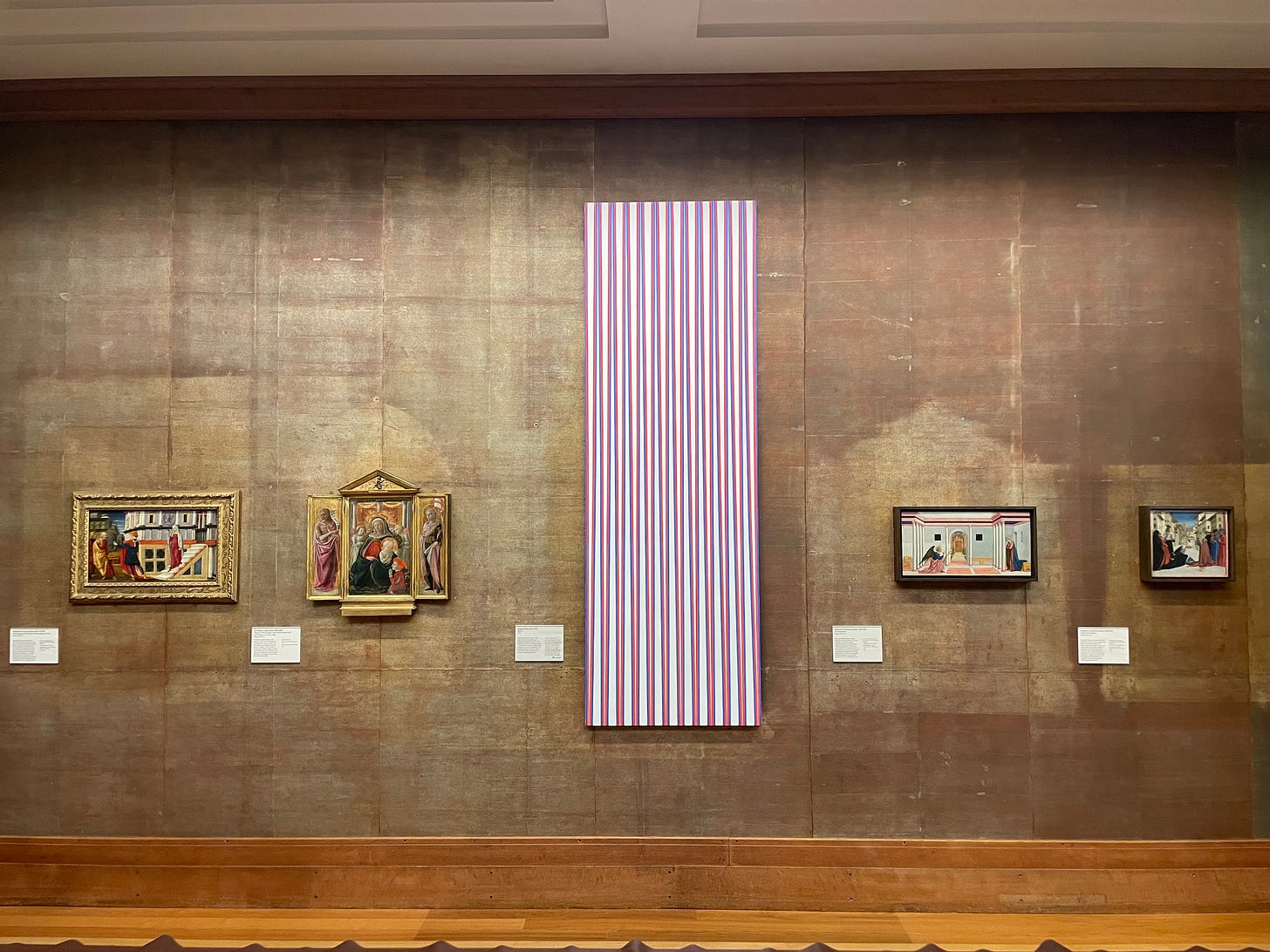 Turn a corner in the Fitzwilliam and you see the opposite of all this, like one of Constable’s rainbows emerging from sodden earth, a vertical canvas made by Bridget Riley in 1968, Banner, displayed alongside Italian fifteenth-century painting, itself a time of origins and emergence.