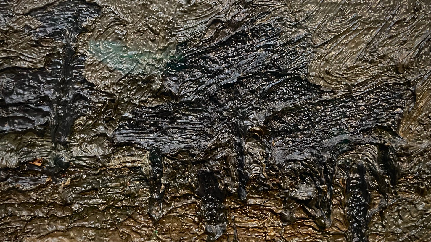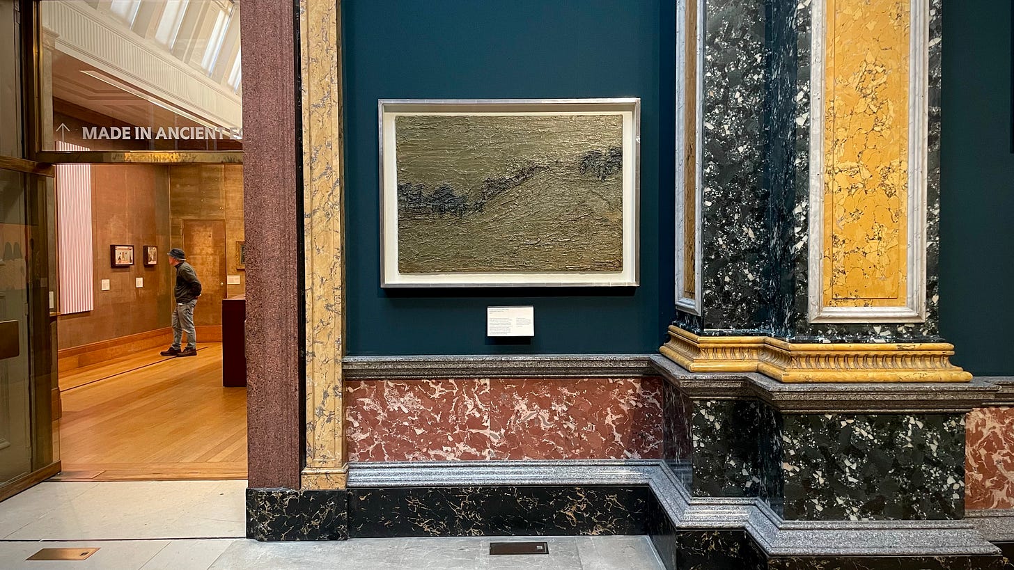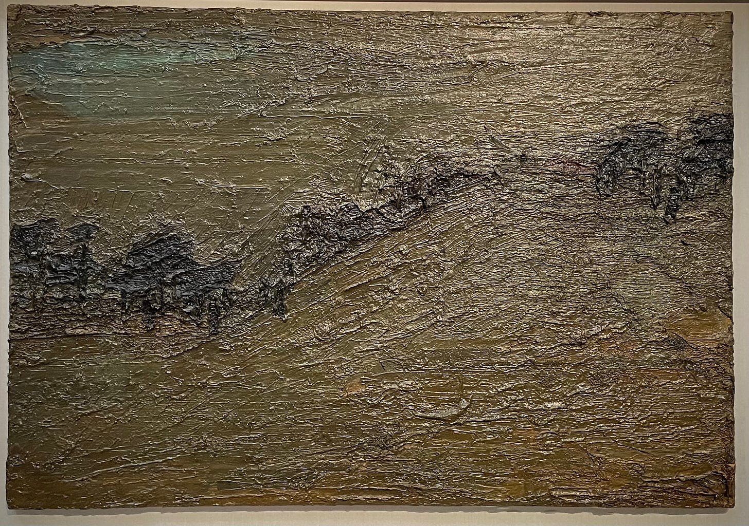 And in paintings such as Primrose Hill: Winter Fog, hanging in the Fitzwilliam Museum in Cambridge, Auerbach takes painting to this degree zero, painting as a dunghill, as the origin of the world.