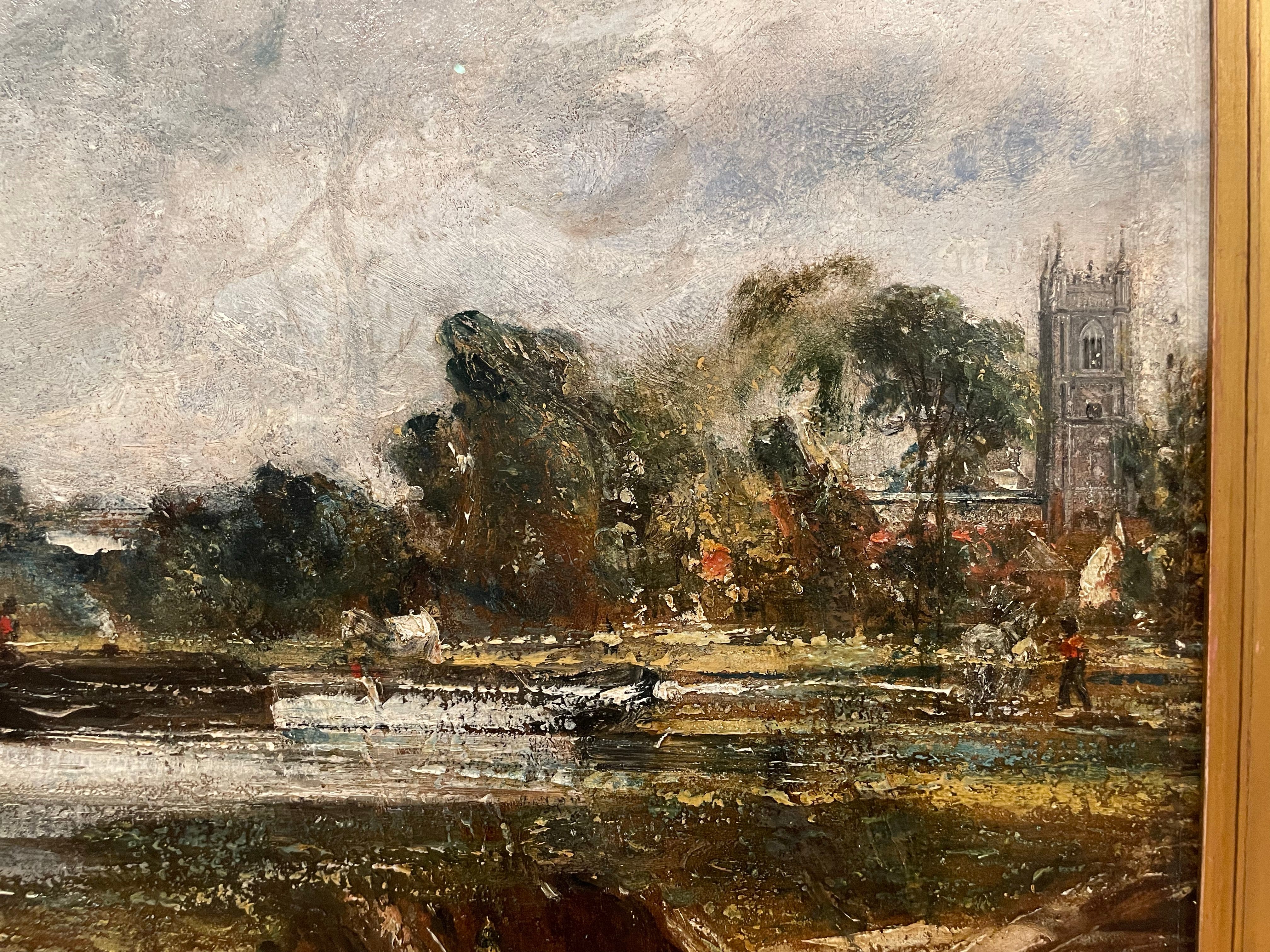 The tower of Dedham church has appeared on the right hand side, painted in an almost comically fastidious style. Dedham church is like a Tardis in Constable’s paintings, turning up all over the place for compositional convenience.