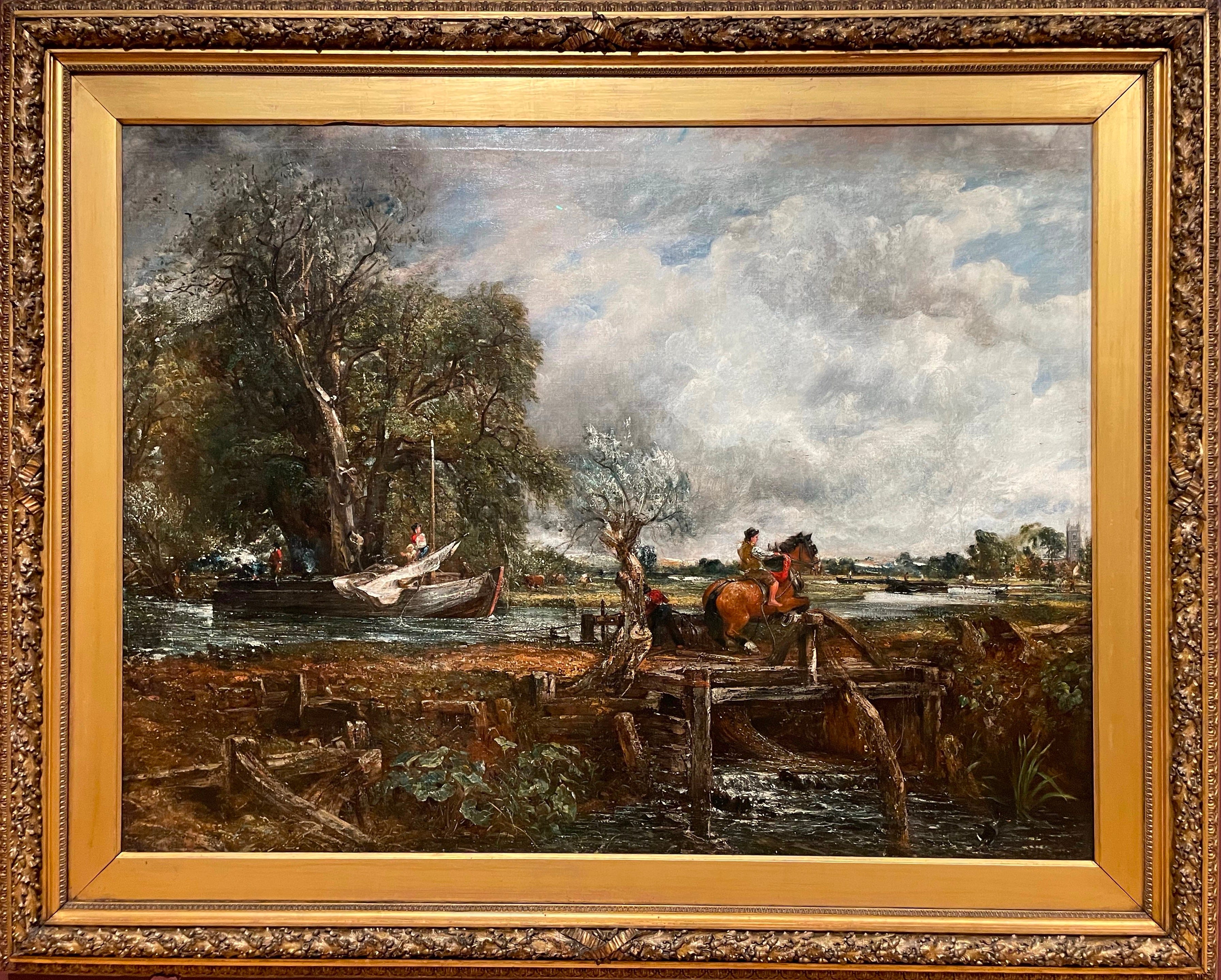The Leaping Horse shows just that — a horse leaping over a wooden barrier on a towpath of the river Stour. On the far bank of the river is the barge that it is towing, pausing in its journey up river. Another barge waits alongside, perhaps with a tow horse just out of shot. Behind the first barge, through a gap in the trees are two dark silhouetted figures.