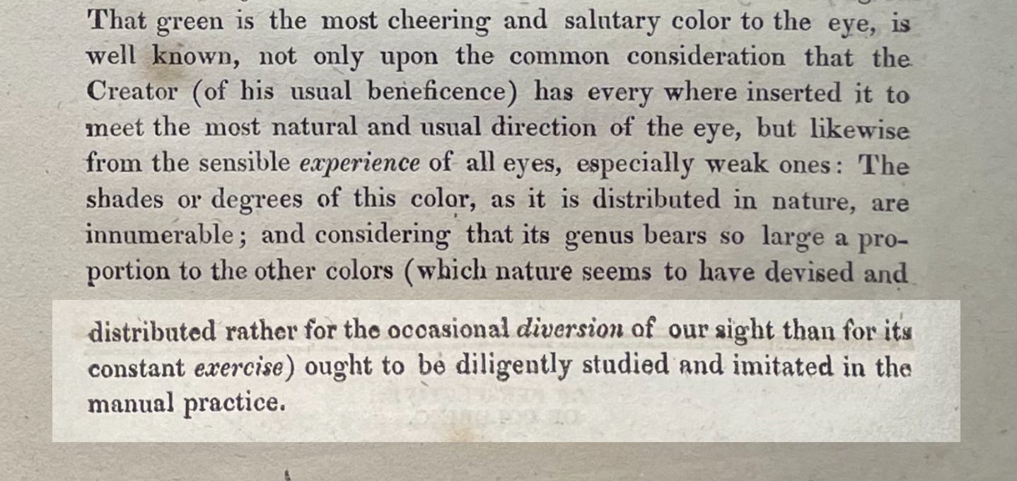 ‘Constable says that the superiority of the greens in his meadows is due to the fact that it is made up of a large number of different greens. What gives a lack of intensity and life to the verdure of the ordinary run of landscape painters is that they do it with a uniform tint. What he says about meadows can be applied to all the other tones’.