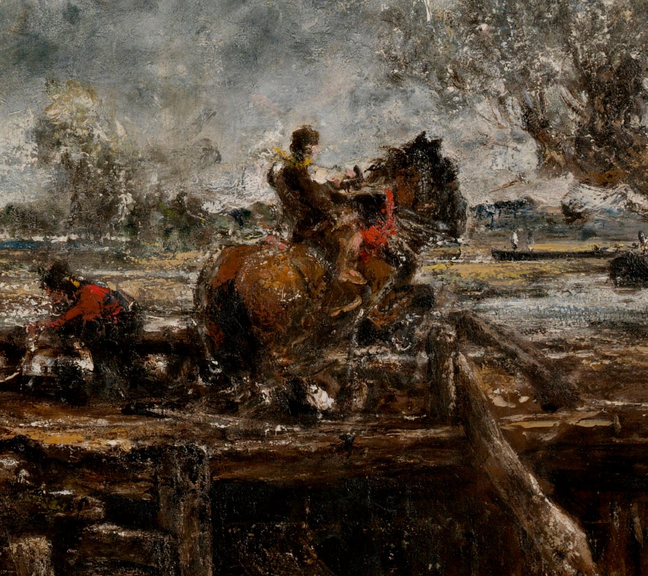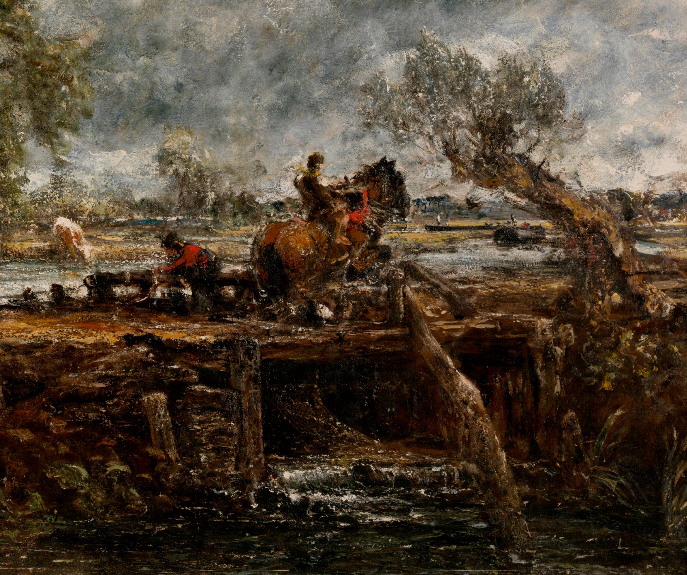 The horse is leaping on a wooden structure housing a sluice, like the entrance to a dark tunnel, somehow running beneath the river. The structure itself stretches along the lower half of the painting, and appears like a stage on which the action of the painting is taking place.