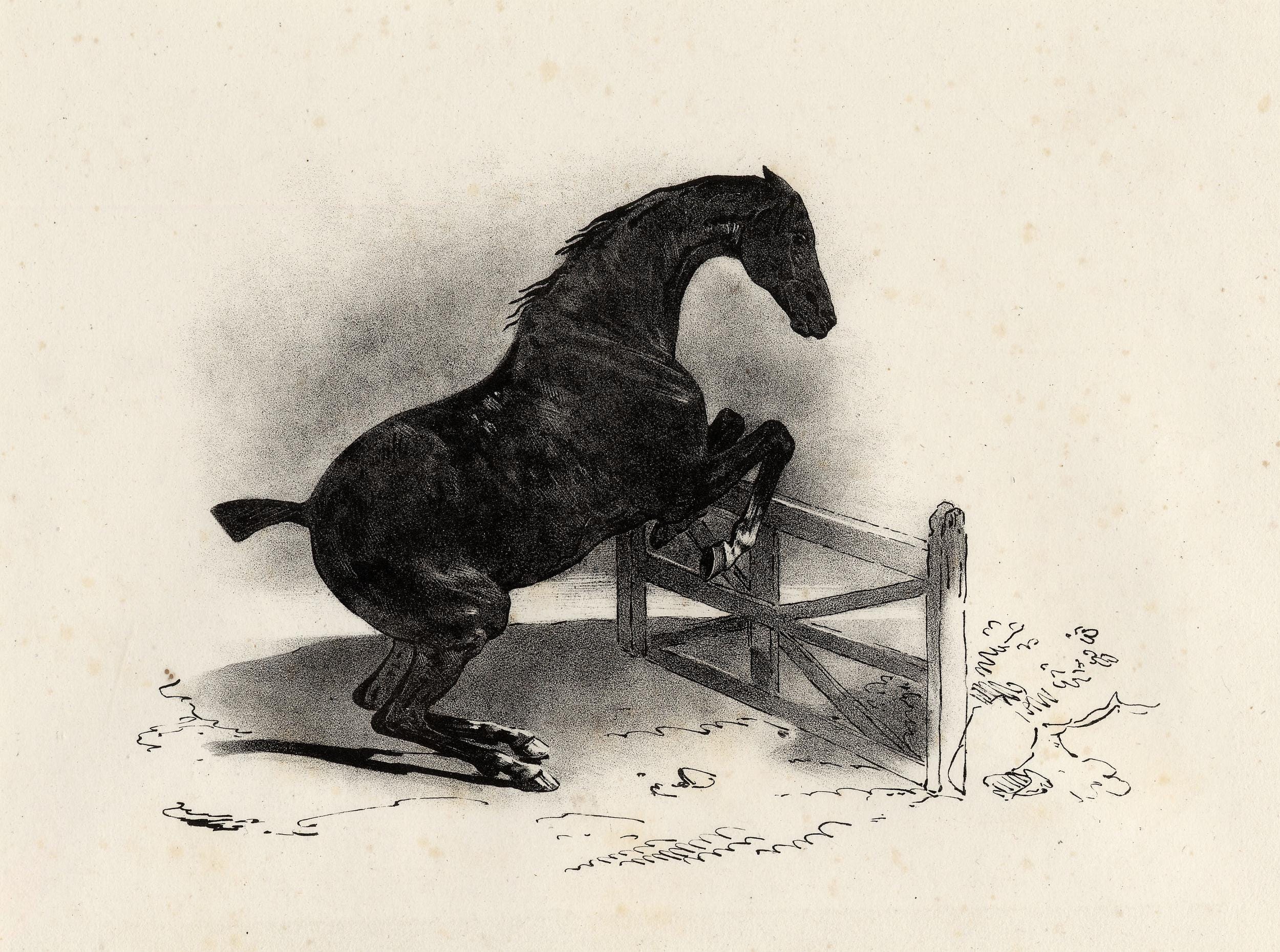Did the horse make the leap over the barrier in The Leaping Horse? A good question, because if you look closely at the horse, it is hardly in a leaping, or jumping position at all — the weight is on the back legs, and it is far too close to the wooden barrier to clear. (Horse lovers and equestrianists?)