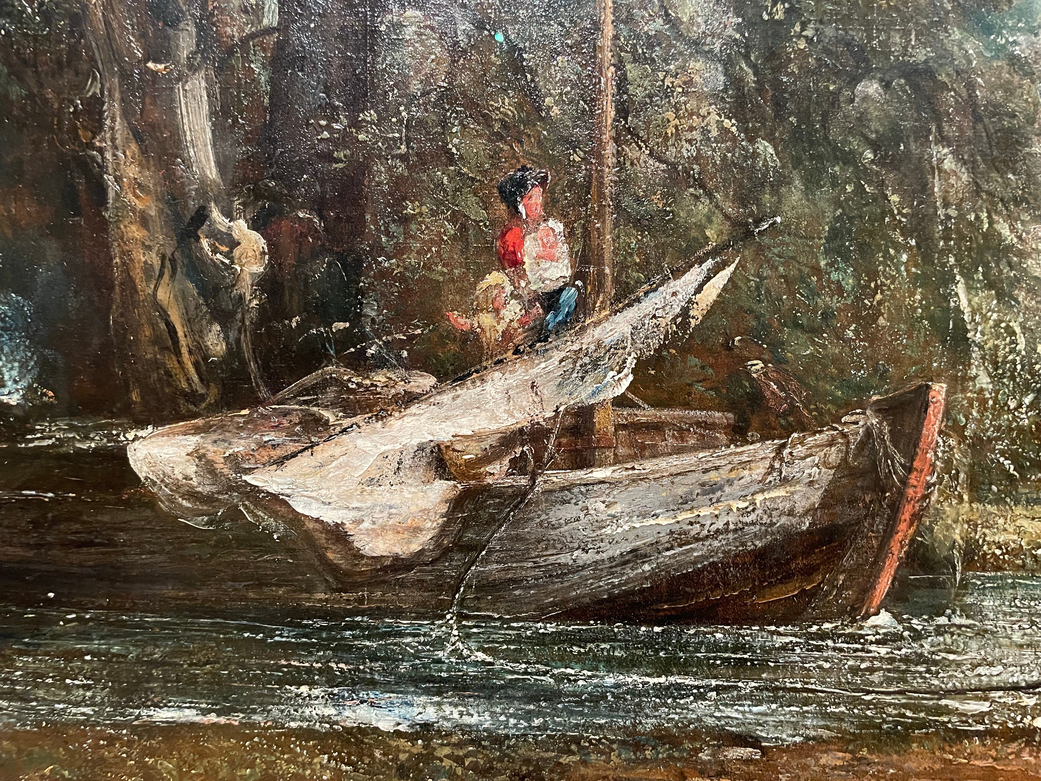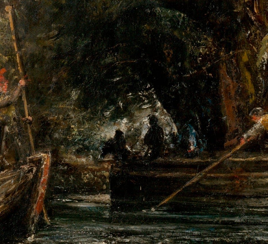 Another intriguing detail is that of the figures standing in the barge on the opposite bank. In the first version they are indistinct barge workers. In the finished version it is clearly a woman holding a baby with a young child by her side.
