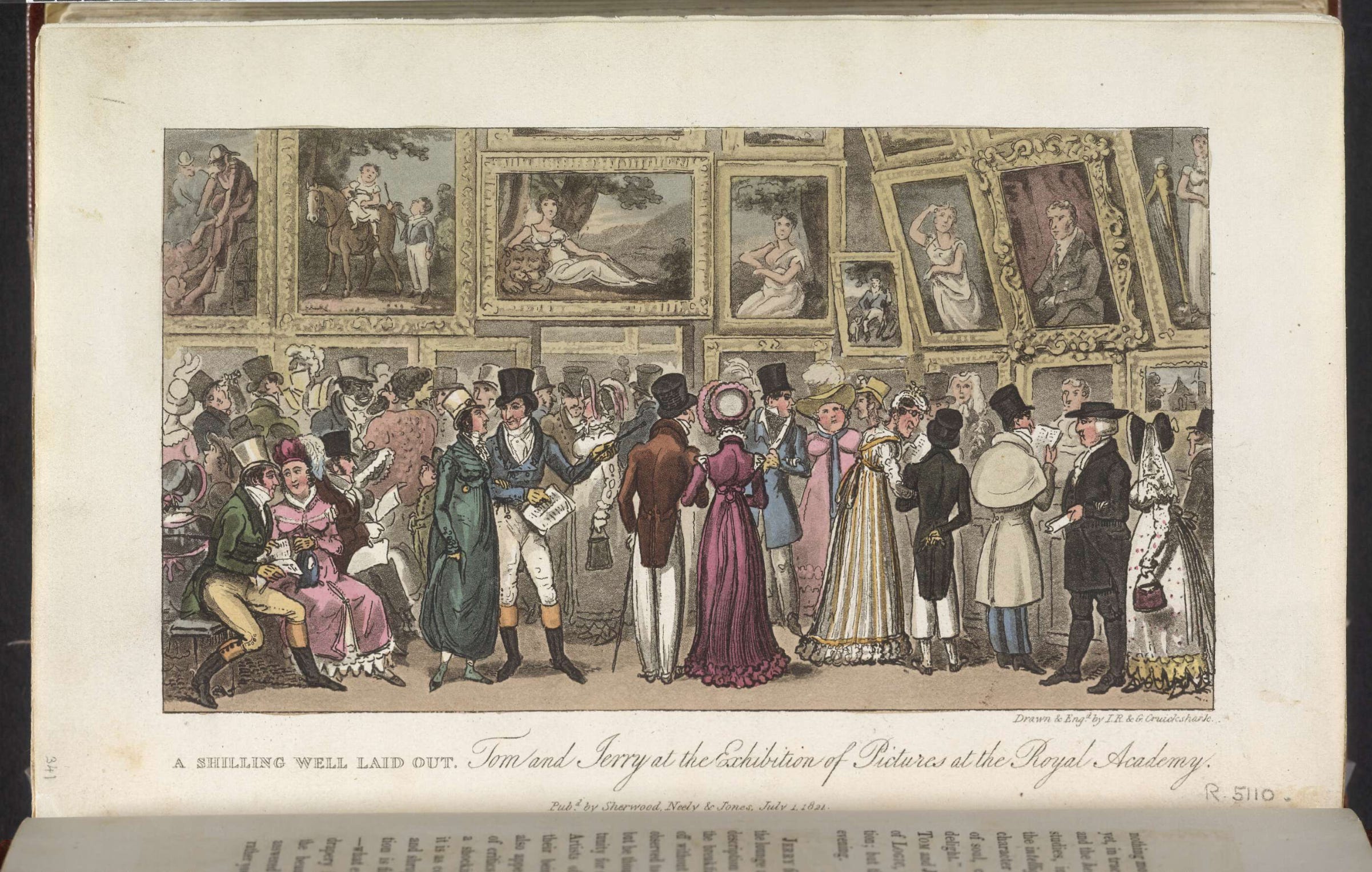 Fortunately, we have an image of the 1821 exhibition, a gently satirical drawing by George Cruikshank, made for the bestselling novel by Pierce Egan Life in London, or, the Day and Night Scenes of Jerry Hawthorn, esq., and his elegant friend, Corinthian Tom, accompanied by Bob Logic, the Oxonian, in their rambles and sprees through the Metropolis. (It was adapted into a West End hit called Tom and Jerry).