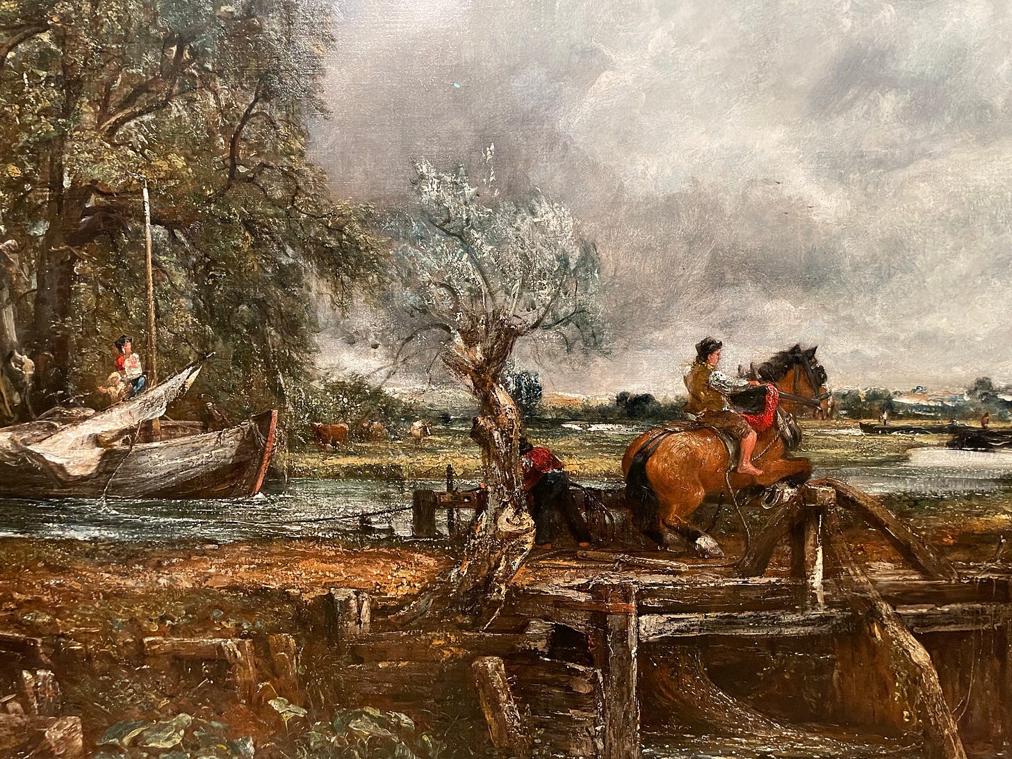And on the face of it this is what we see — a moment captured from an ordinary day on the River Stour, men working the barges, tow horses with their distinctive red harnesses at work, cows drinking, the wind agitating the surface of the river and ruffling the silvery leaves of a pollarded willow.
