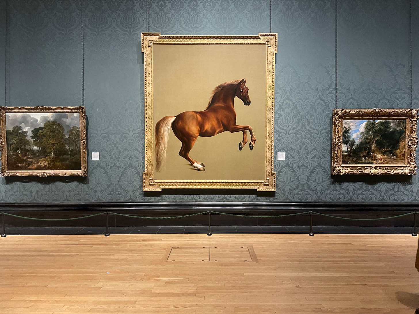 I love watching people stop and look at Stubbs’s painting, take photos, pose with it, wander around the gallery and invariably return for a second look. You can see it the length of the gallery, which I estimate to be around two furlongs (it would be three if the Sainsbury Wing were open), in one of the greatest sightlines in any museum. You can walk the length of the National Gallery, as if Whistlejacket were galloping towards you, through the ages of art.