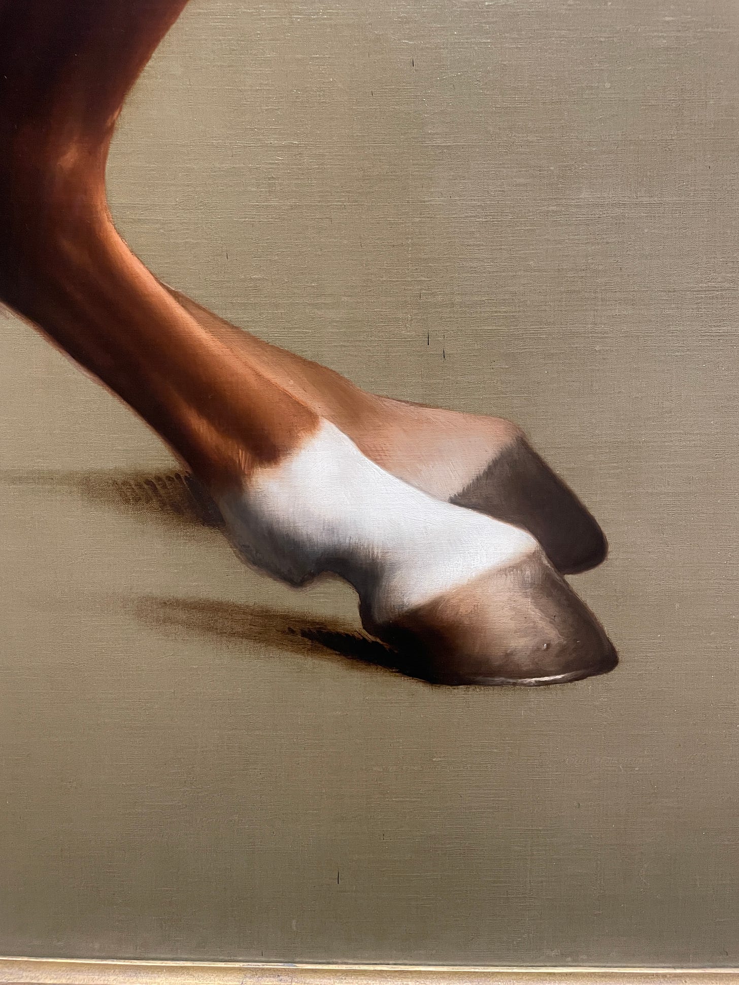 I find it endlessly fascinating: the sense of animal wildness combined with aristocratic ownership; the profound anatomical knowledge that Stubbs brought to painting the animal, a thoroughbred owned by a certain Lord Rockingham; the place it holds in the fascinating history of thoroughbreds themselves, which when it was painted in 1762 were a new breed of horse, created in England by crossing Arabian Stallions with English mares; and the striking modernity of the horse painted against a monochrome background.