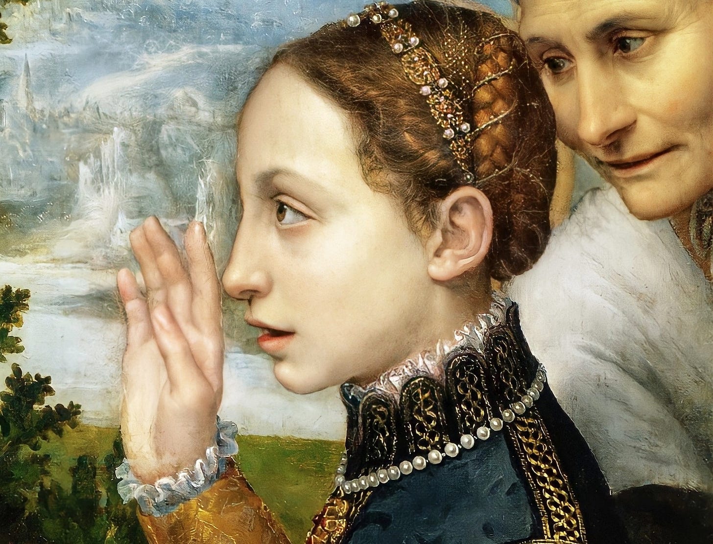 The victorious Lucia is turning to smile at her sister Sofonisba, of course, who is making the painting. Their communal glee is offset by the careworn look of the older woman at right, who might be a servant, or perhaps an older relative. Might it even be their mother, Bianca Ponzoni?