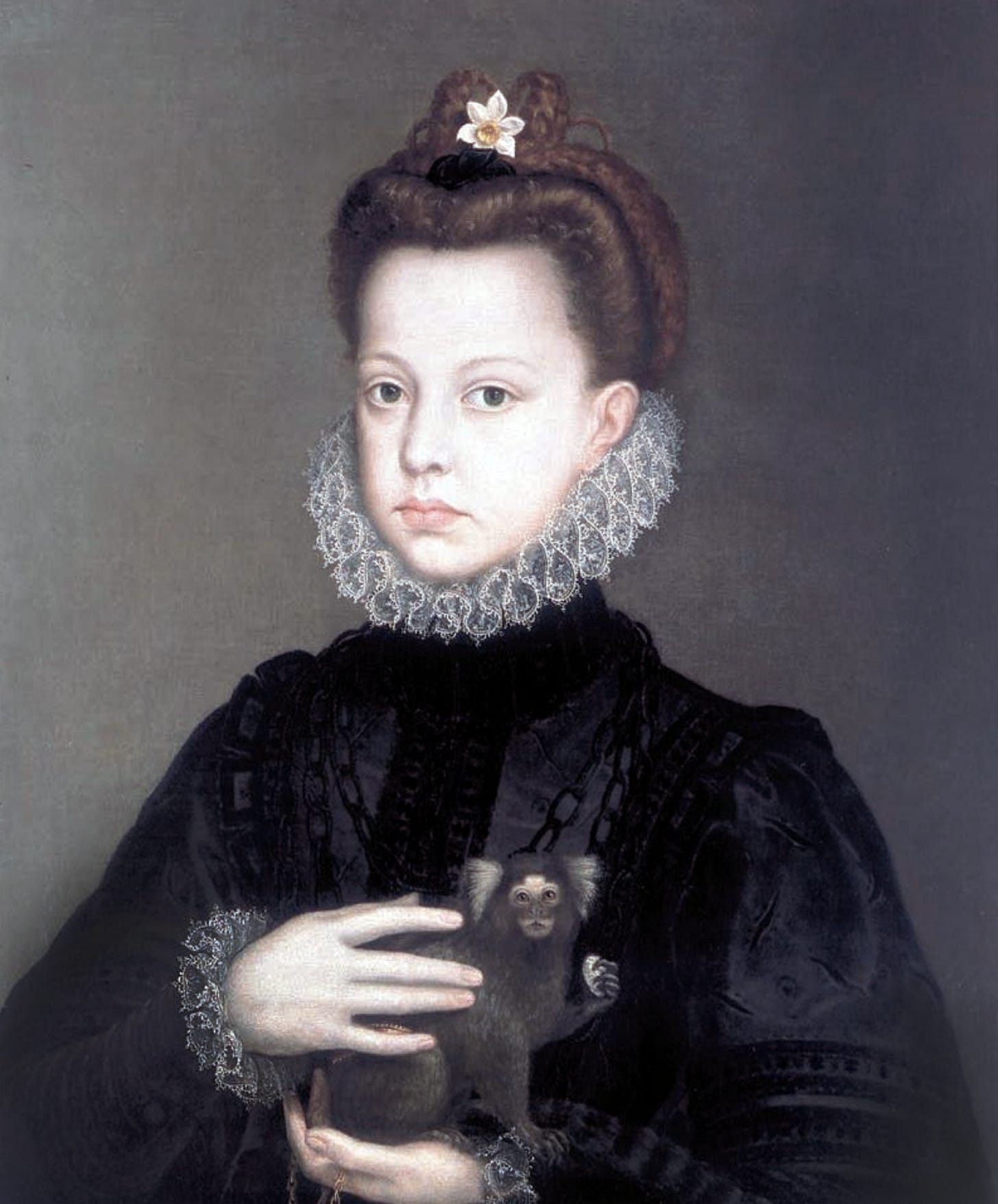 Not a huge amount is known about the paintings Sofonisba made at the Spanish court, aside from some impressive, if official-looking portraits of Isabel and Philip and their two daughters, Isabella and Catalina. One of the best portrays Catalina holding one of the most impressive Brazilian marmosets in art.