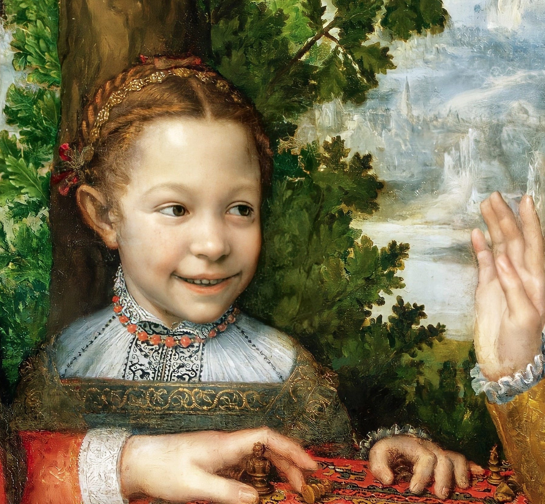 On the left, Sofonisba’s younger sister, Lucia, turns to smile as she takes the queen of her opponent, Minerva (sister number four), while the youngest, Europa, smiles gleefully, showing her teeth (very rare in painting). Minerva expresses both admiration and surprise at her older sister’s cunning. Her raised right arm feels slightly in the wrong position, but this only adds to the charm and innocence of the image.
