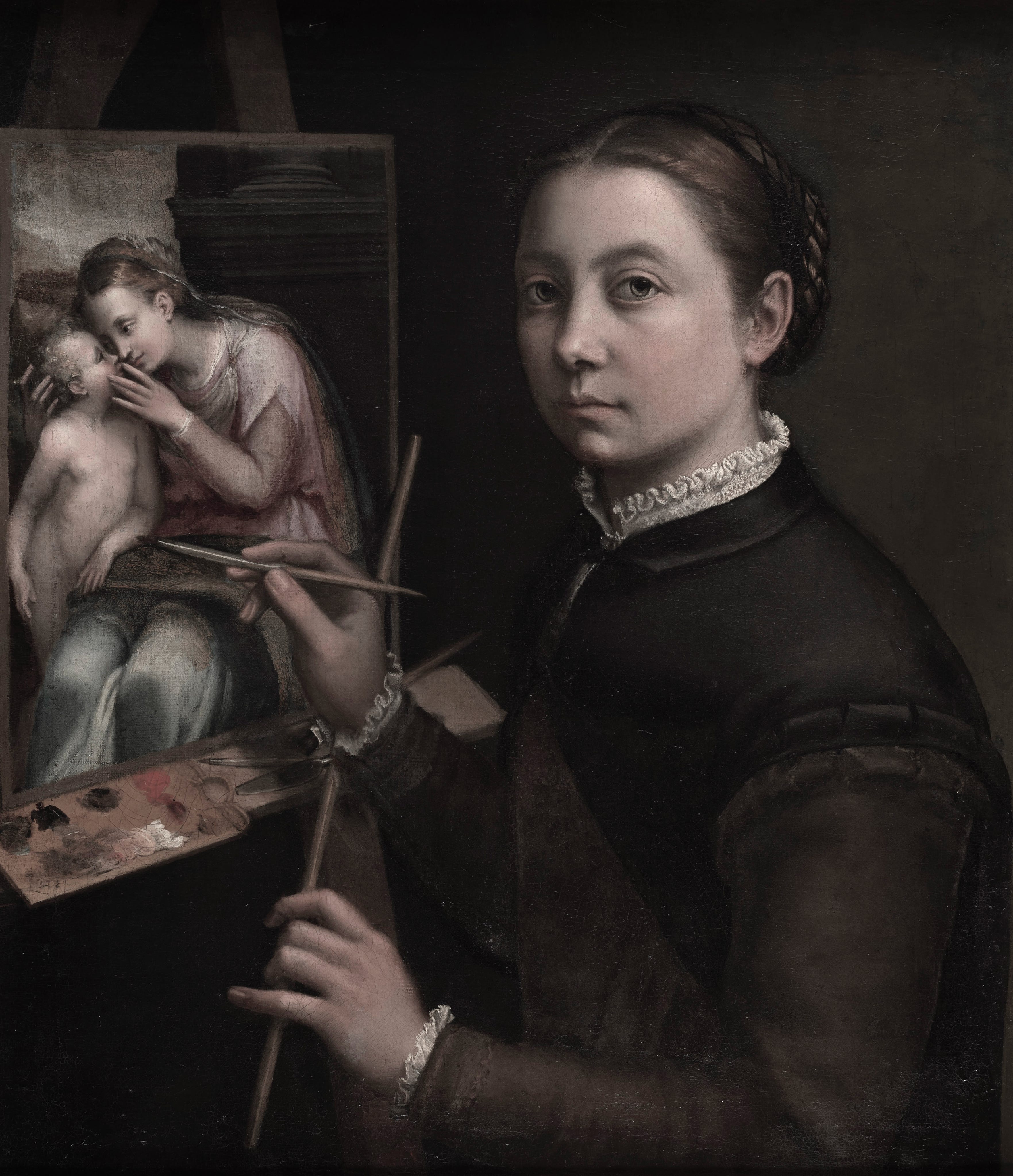When we talk about Sofonisba, then, we are talking largely about the paintings she made in the first two decades of her career, including many self-portraits, some showing her sitting at the easel, paintbrush in hand. In a painting now in Poland, she is putting the finishing touches to a very moving image of the Virgin and Child, ‘a quattr’occhi’, as the Italians say — intimately eye to eye. It is a painting of motherhood, beyond any religious significance, but also a painting about making painting, about representation itself.