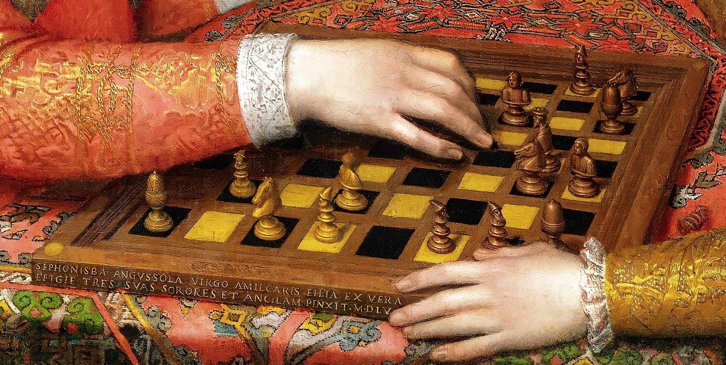 It was around the age of twenty that Sofonisba made one of her greatest paintings, and one of the most wonderful inventions of sixteenth-century art. It is a remarkable family portrait by one of the most fascinating painters of the sixteenth century, and also (in my opinion) the greatest painting ever made showing the game of chess.
